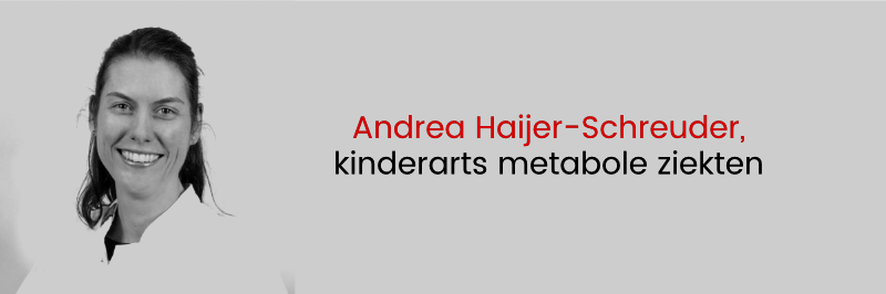 Mijn naam is Andrea Haijer en ik ben nu bijna 2 jaar werkzaam als kinderarts metabole ziekten in het Beatrix Kinderziekenhuis, UMCG. Ik heb mijn opleiding tot kinderarts gevolgd in het UMCG, en na een half jaar werkzaam te zijn geweest als algemeen kinderarts in een groot perifeer ziekenhuis, kreeg ik in 2021 de kans om te starten met een fellowship metabole ziekten. Het vak metabole ziekten is ontzettend breed. Niet alleen omdat er zoveel ziektebeelden zijn, maar ook omdat de ‘dokters-(en mens)-vaardigheden’ die het vak van je vraagt zo uiteen lopen: van de ‘familiedokter’ van sommige gezinnen tot aan de wetenschapper die zich bezig mag houden met innovatieve therapieën. Dit maakt het vak voor mij uitdagend. Poliklinisch vervolg ik patiënten met een metabole ziekte in de volle breedte van het vak. Ik heb dus een zeer diverse patiëntenpopulatie. Op researchgebied ligt mijn interesse bij de glycogeen stapelingsziekten.